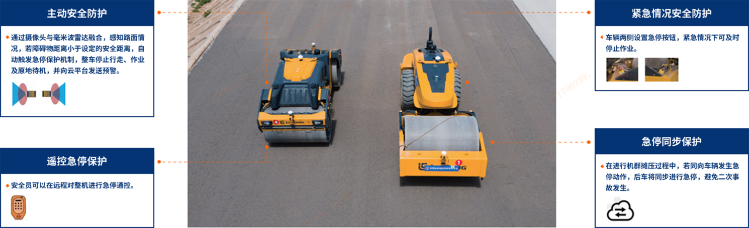 摊铺机、压路机等全系列无人驾驶产品加持,保证施工安全,提高施工效率,基于北斗高精度定位、惯性导航和雷达多传感融合技术实现对施工碾压轨迹的精准控制,控制精度达厘米级。