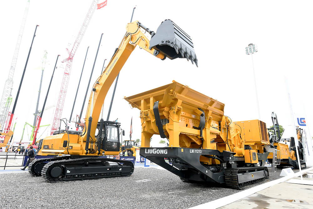 细心的观众还会发现,柳工室外整机展位展出了两个“黄金搭档组合”,一个是890H装载机搭配DW90A宽体车模拟采矿作业;而另一个组合是939E挖掘机、LM S48履带式反击式破碎站和LM I1213履带式筛分站在进行矿石破碎筛分的工况模拟,这两个组合便是矿山工程施工核心机械的成套产品组合,广泛应用于各类矿山作业。