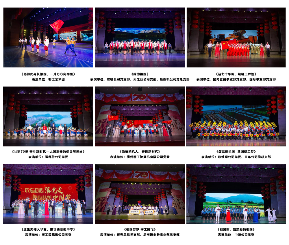 24家基层单位组成的10支表演团队依次登台,用诗歌、音乐、舞蹈重温激情岁月,表达柳工人对伟大祖国的赤子之情,唱响昂首新时代,共筑中国梦的时代主旋律。