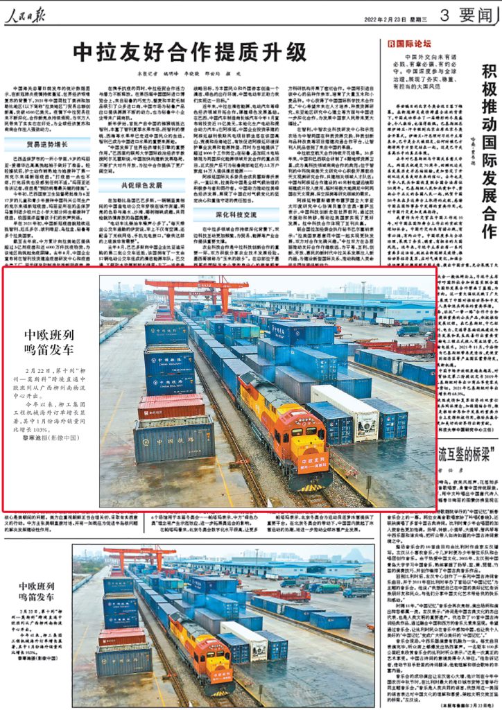 2月23日,《人民日报》要闻版刊发图片新闻,关注2022年柳工海外订单增长情况。