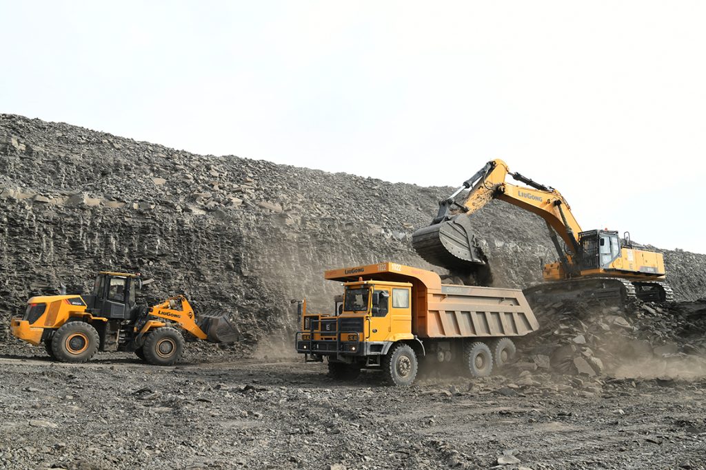 往里深入,在一处煤矿作业区,远远便看到了霸气的柳工970E挖掘机正在娴熟地进行煤矿表层土石的剥离作业,配合它一起施工作业的还有柳工856H装载机、多台往返拉运煤矿渣土的柳工DW90A宽体自卸车,以及为煤矿渣土进行推土平整的柳工B320推土机。