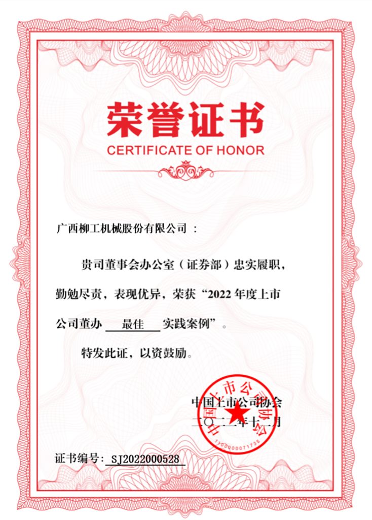 荣誉的获得是中上协对柳工董秘及董办工作成果的肯定,也是柳工董事会的倾力指导及规范运作的成就。