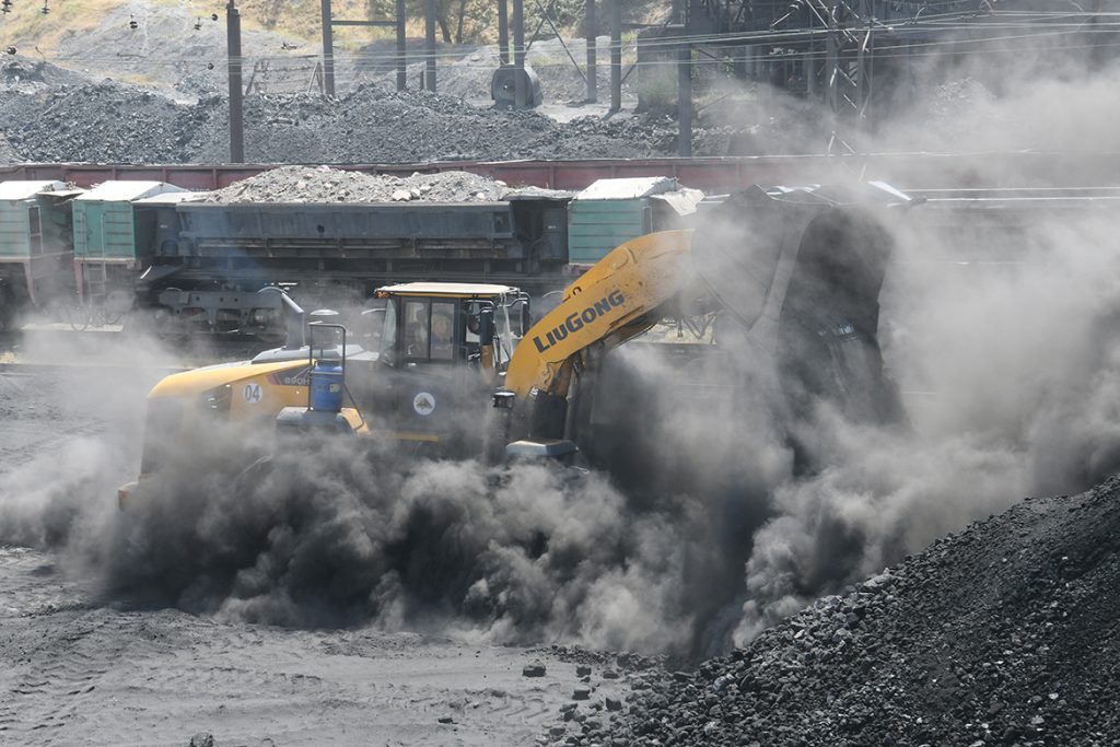 在塔什干某煤矿开采现场,只见柳工890H装载机正在给火车皮里装上煤渣,煤灰漫天飞舞,柳工设备依然强劲有力。