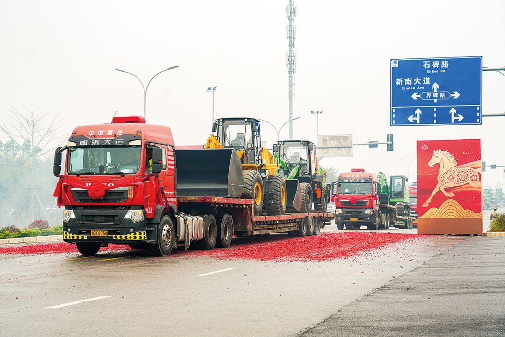 “发车!”2月24日,安徽柳工新春复工暨首批设备发车仪式现场,多吨位、多系列的十余台起重机驶出生产车间,奔赴海内外客户所在地。