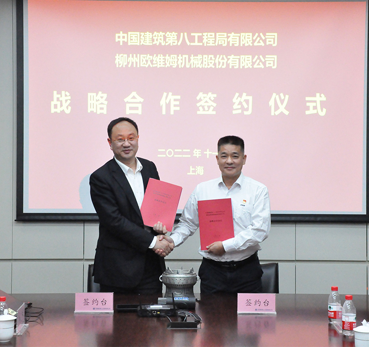 11月19日,中建八局与柳工欧维姆公司党建联建交流会暨战略合作签约仪式在中建八局总部举行。柳工欧维姆公司董事、副总经理陈昱鹏、中建八局总工程师亓立刚进行深入交流会谈,并见证双方签约。