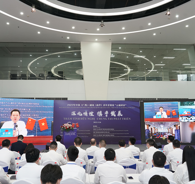 5月26日,“深化情谊 携手发展”——2022年中国(广西)—越南(高平)青年企业家“云端对话”活动在柳工全球研发中心举办,以“线上+线下”形式同步开展,来自中越两国近百名优秀青年企业家相聚“云端”,互学互鉴、共话发展,共谋企业国际化成长之路。
