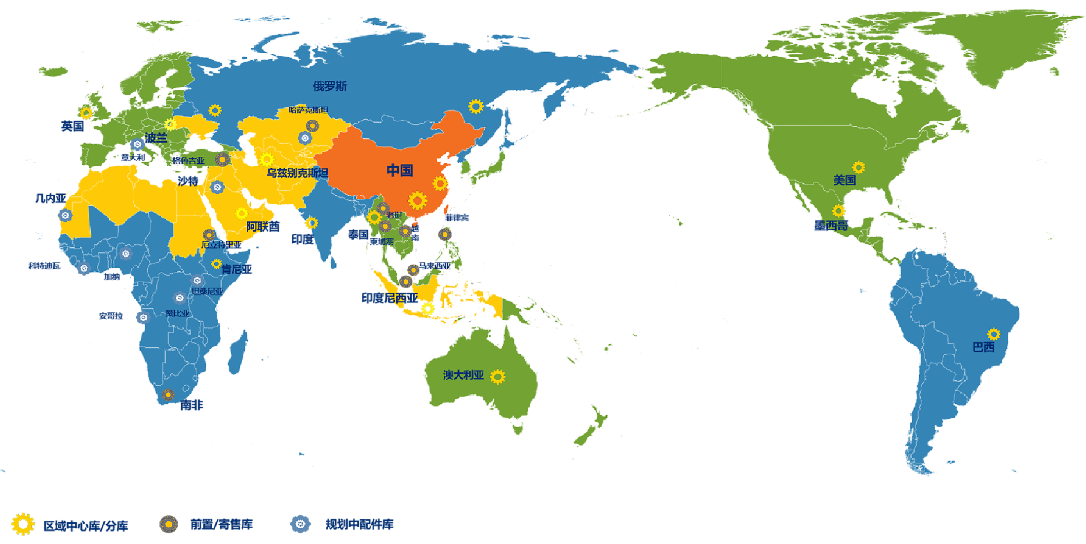 10个配件中心库、 13个区域分库、海内外前置仓&寄售仓