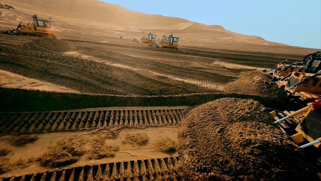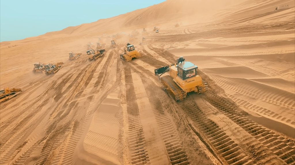 乌兰布和沙漠风沙活动频繁,地形复杂多变,对施工设备是严峻考验。面对松软的沙丘、强烈的风蚀以及高温严寒的极端环境,柳工推土机凭借其卓越的稳定性、强劲的动力性能和针对风沙环境优化的可靠性,成为项目方信赖的选择。