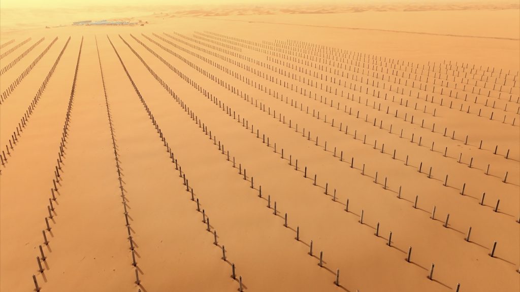 平整好的土地上,一片片深蓝色的光伏板正有序铺开,形成壮观的“光伏蓝海”。这些光伏板不仅能将强烈的沙漠阳光转化为清洁电能,输送至千家万户,更在悄然改变着板下的微环境。光伏板的遮挡有效降低了地表水分蒸发,减弱了风蚀,为板下和板间种植耐旱植物创造了有利条件。黄沙深处,点点新绿正顽强萌发,“板上发电、板下治沙、板间种植”的生态经济新模式在这里变为现实。