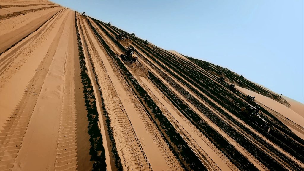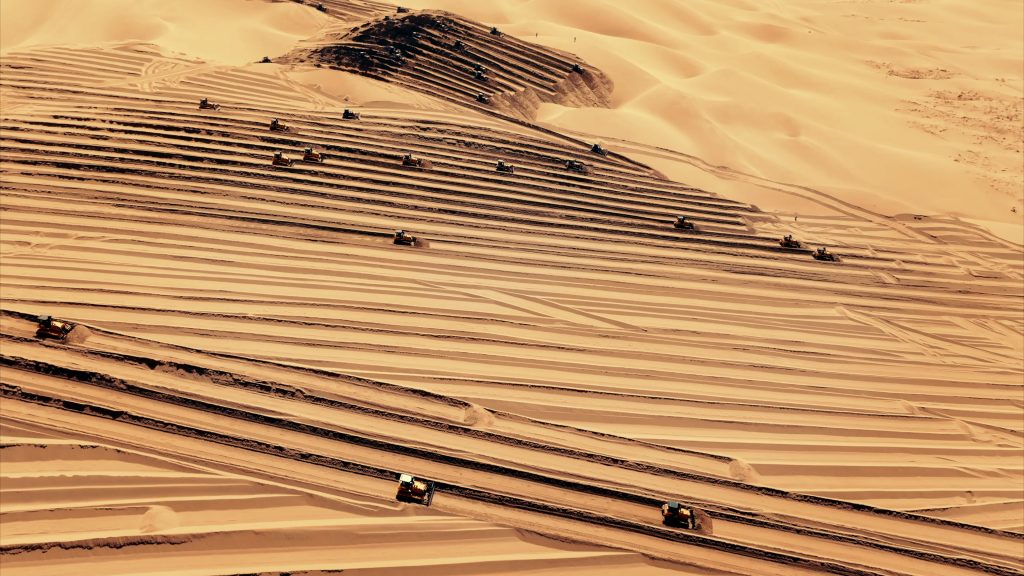 在曾被称作“死亡之海”的乌兰布和沙漠腹地,一场颠覆认知的变革正轰轰烈烈上演:上百台柳工推土机如移动的钢铁堡垒,昼夜不息地碾过连绵沙丘。轰鸣声中,千年流动的黄沙被强劲履带压实、推平,起伏的沙海渐次化作辽阔坦途。这是一场关乎国家能源未来与生态复兴的“沙漠重塑计划”——为全球最大规模的“沙戈荒”风电光伏基地铺设生命线。
