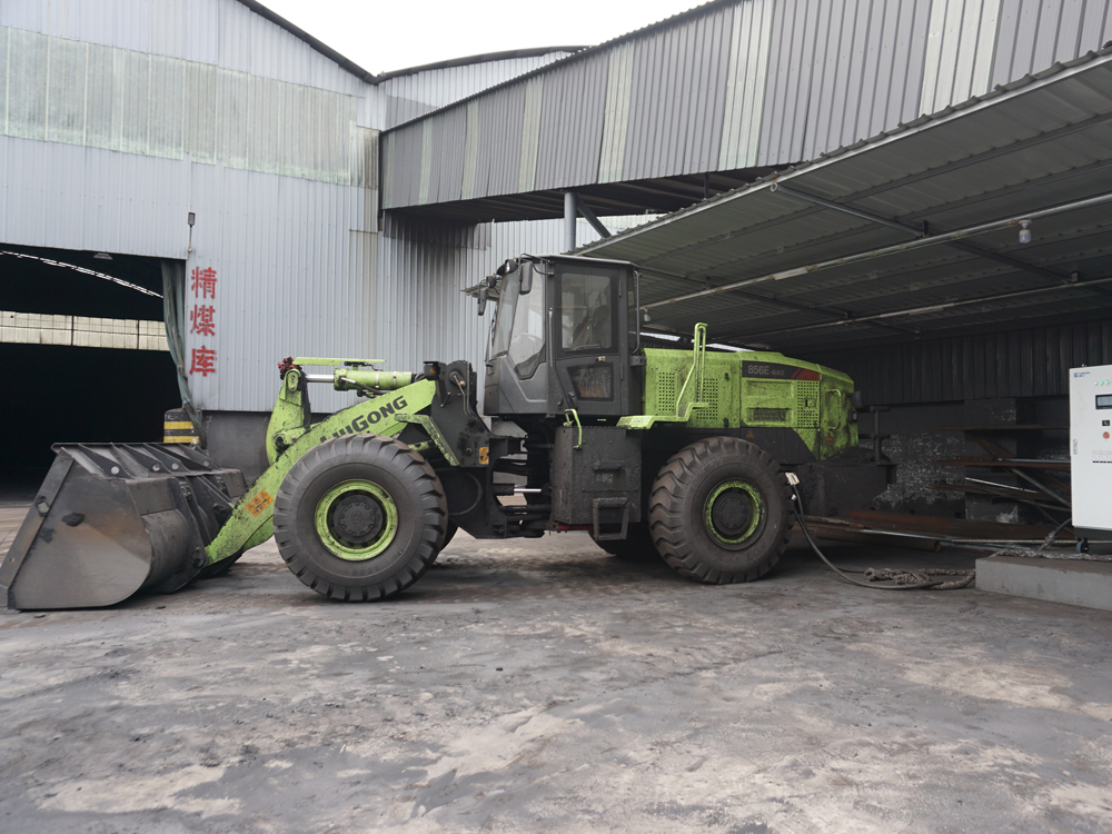 这阵“绿旋风”就是柳工856E-MAX装载机,它是临汾周边洗煤厂的第一台电动装载机设备。